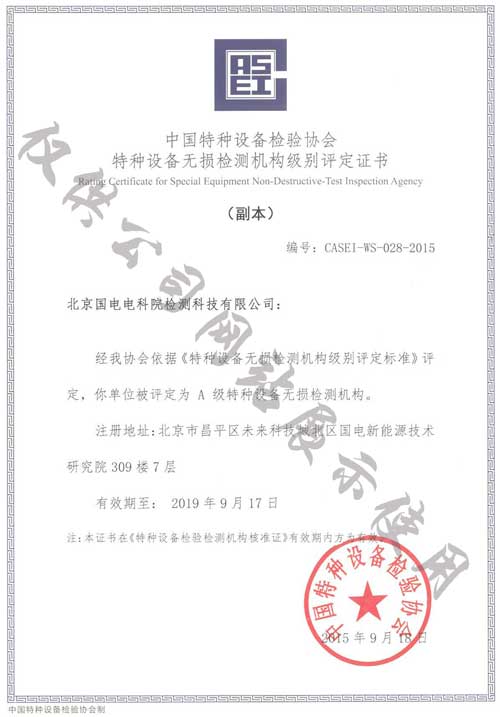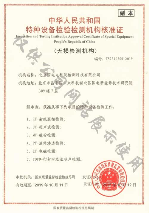 公司技术力量雄厚,具有国家质量检验检疫总局颁发的特种设备检验无损检测机构A级资质核准证(RT、UT、PT、MT、TOFD、ET)、设备监理单位乙级资质、国家和中关村高新技术企业证书、三标体系认证证书、辐射安全许可证、设备监造资质证书等,可独立开展第三方检验服务,可承接各类行业的锅炉、压力容器、压力管道、大型储罐、钢结构等特种设备的无损检测及金属材料理化检验等技术服务,主要服务于各发电集团,包括基建机组设备安装前锅炉压力容器、压力管道等金属部件安全性能检查,机组吹管后奥氏体钢弯头(不需割管)及联箱内残留物质量监督检验,在役运行机组的金属监督部件的金属检验,并可承担复杂设备的焊接修复技术服务。